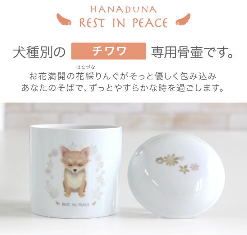 チワワ専用の犬種別ペットイラスト骨壷。柔らかい優しいタッチの可愛い骨壷です。 suyarinペット仏具の新シリーズ「はなづな」のイラスト骨壷になります。 チワワの特徴を繊細に描き、安らかに大好きなご家族を思う心和む表情が少しでも伝わるようにデザイナーが心を込めて描きました。大切なペットとの思い出を、イラスト骨壺【3.5寸】チワワで永遠にお守りください。