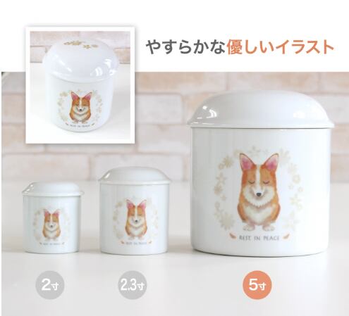 「イラスト骨壺【5寸】コーギー」は、甘えん坊なコーギーが描かれた、可愛い骨壺です。ペットちゃんとの別れは、とても辛いことです。しかし、この骨壺を使うことで、少しでも心の支えとなり、今まで一緒に過ごした時間を思い返すことができます。コーギーの愛らしい表情に、胸がキュンとなる方も多いかと思います。特別な思い出を大切にしたい方、ペットちゃんへの愛情を形にしたい方の骨壺です。